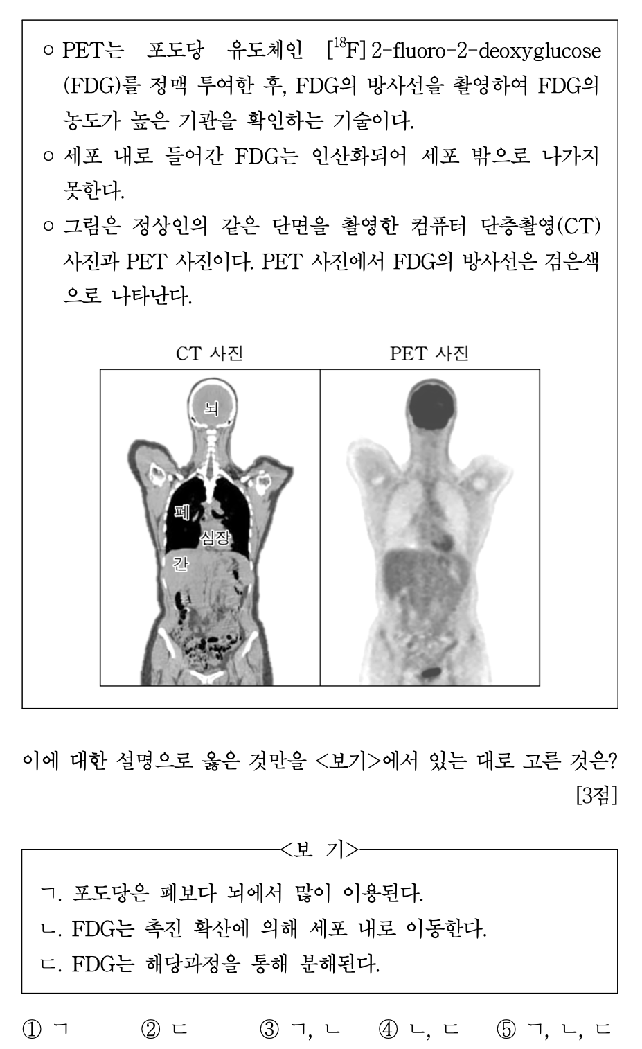 14. 다음은 양전자 단층촬영(PET)을 통해 사람 기관의 포도당 대사 활성을 알아본 자료이다. 이에 대한 설명으로 옳은 것만을 ⟨보기⟩에서 있는 대로 고른 것은?