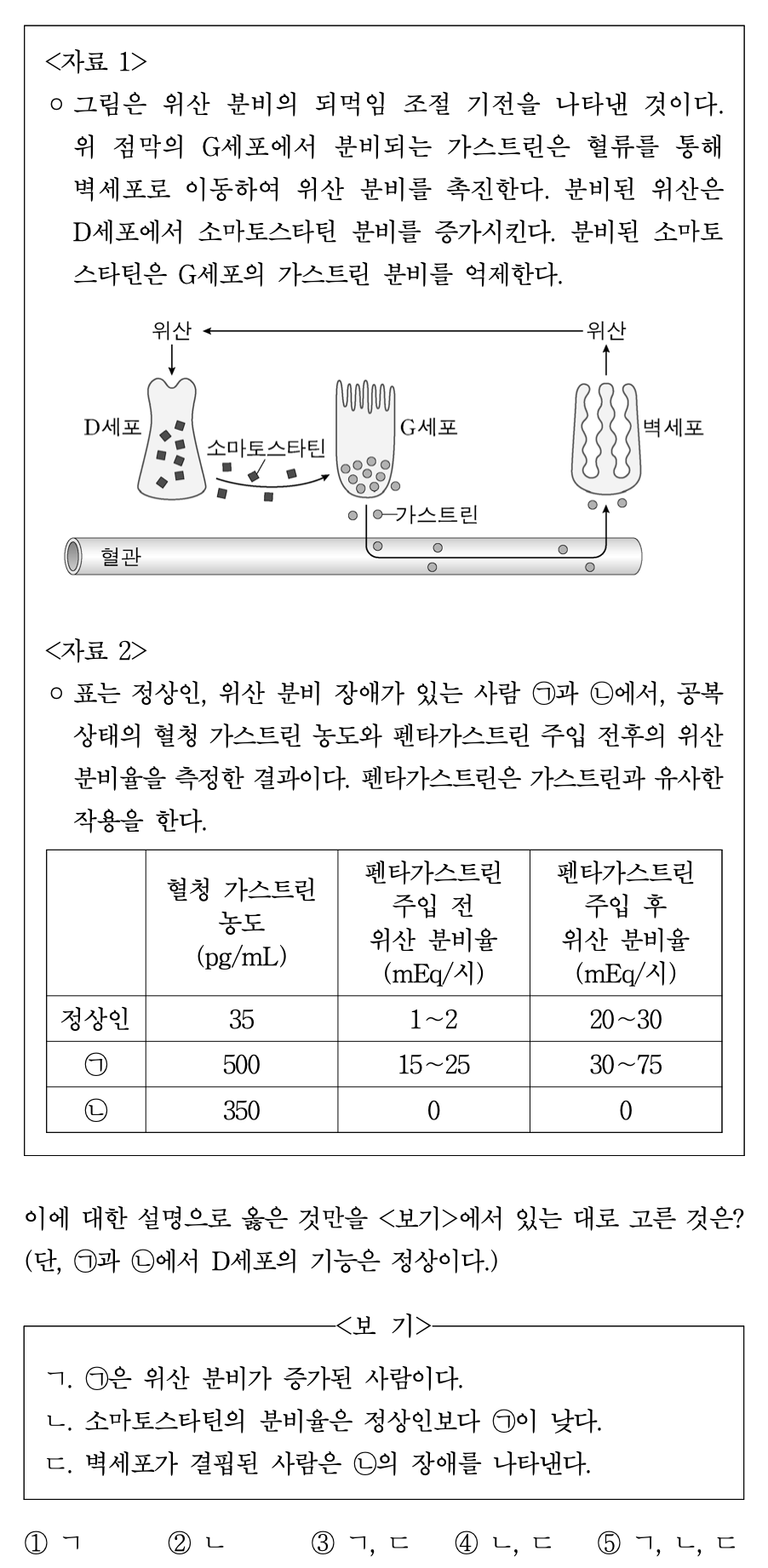 ○ ㄴ : D세포의 기능은 정상이므로 위산 분비가 많이될수록 이를 억제하기 위해 소마토스타틴 분비가 증가함