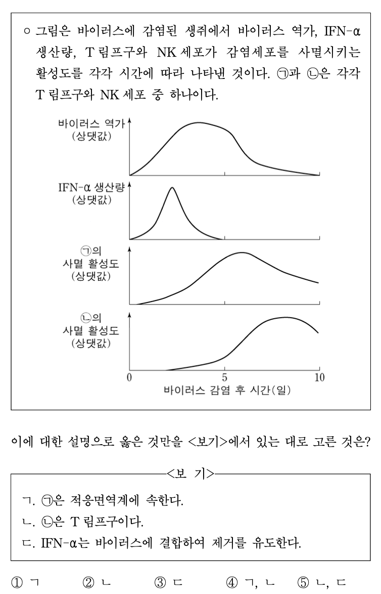 20. 다음은 어떤 바이러스에 의해 유도되는 면역반응에 대한 자료이다. 이에 대한 설명으로 옳은 것만을 ⟨보기⟩에서 있는 대로 고른 것은?