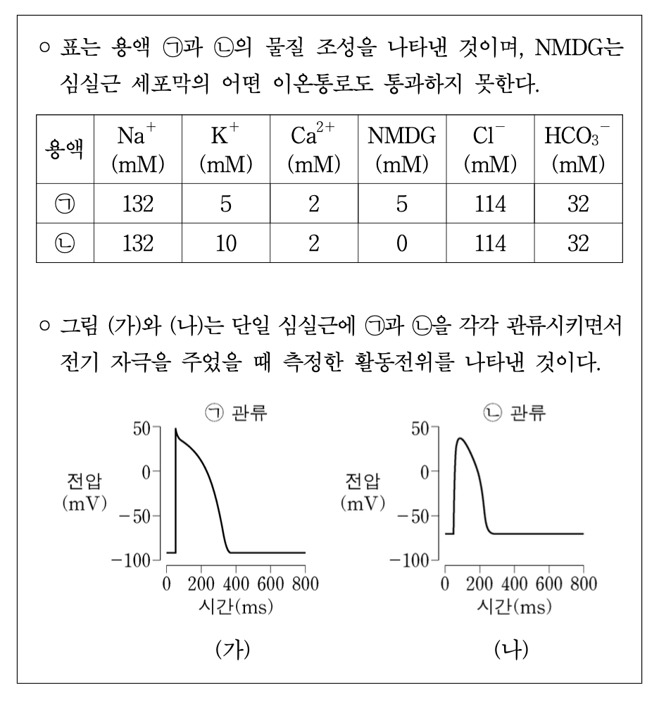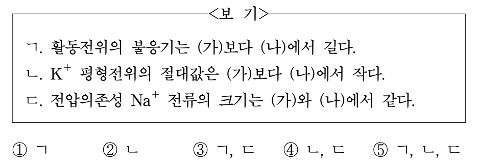 ○ ㄴ : 그래프 상에서 최초 평형 전위는 K+ 평형전위로서 (가)는 -90 mV 정도이고 (나)는 -70 mV 정도. 세포내액의 K+ 농도가 높은데, 세포밖 K+가 증가하면 K+ 평형전위 = (RT / ZF) ln (Xout / Xin)은 덜 음성이기 때문에 절대값이 작아짐