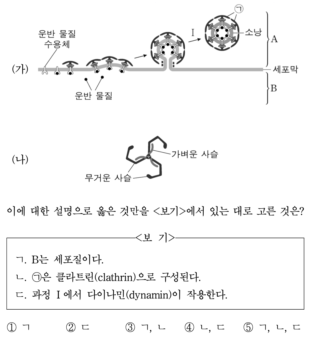 ○ ㄷ : 세포 내로 막이 함입될 때 어댑틴(adaptin), 클라트린(clathrin-coated pit), 디나민(dynamin) 관여
