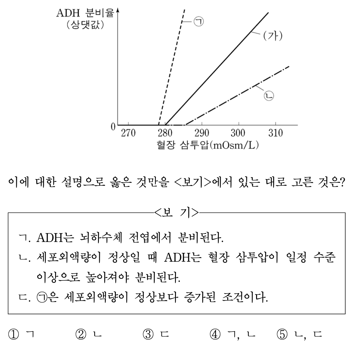 ○ ㄴ, ㄷ : 세포외액량 적어지거나 그에 준하는 혈장 삼투압이 증가할 때 (조직세포로부터 수분을 끌어들여 자칫 탈수를 일으킬 수 있음) 수분 손실을 막기 위해 항이뇨호르몬이 분비