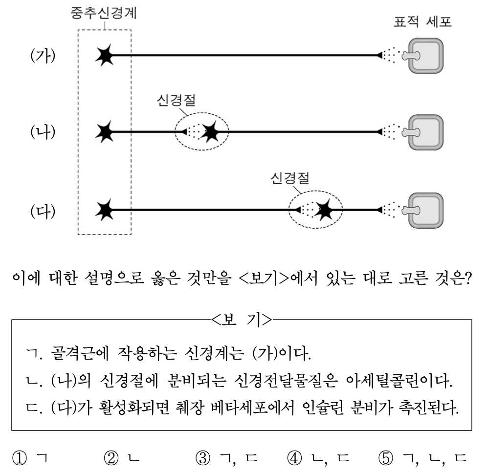 ○ ㄱ : (가)는 자율신경계처럼 절전·절후 뉴런으로 구분되지 않으므로 체성신경계에 해당. ⟨뇌 → 상위운동뉴런 → 척수/뇌간 → 하위운동뉴런 → 말초신경 → 근신경접합부⟩ 경로에서 체성(운동)신경계는 하위운동뉴런에서 시작해 말초신경을 따라 근신경접합부로 이어지는 구간