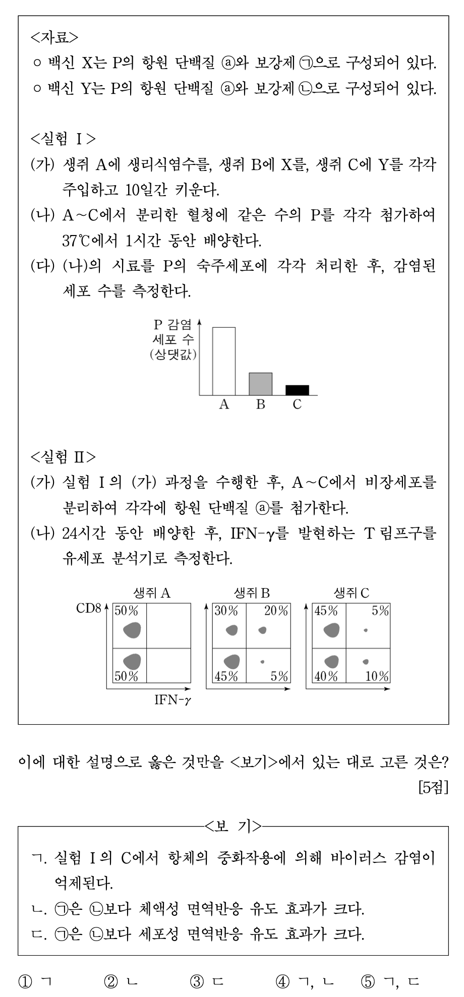 30. 다음은 바이러스 P에 대한 백신의 효율을 증가시키는 보강제(adjuvant)에 대한 실험이다. 이에 대한 설명으로 옳은 것만을 ⟨보기⟩에서 있는 대로 고른 것은?