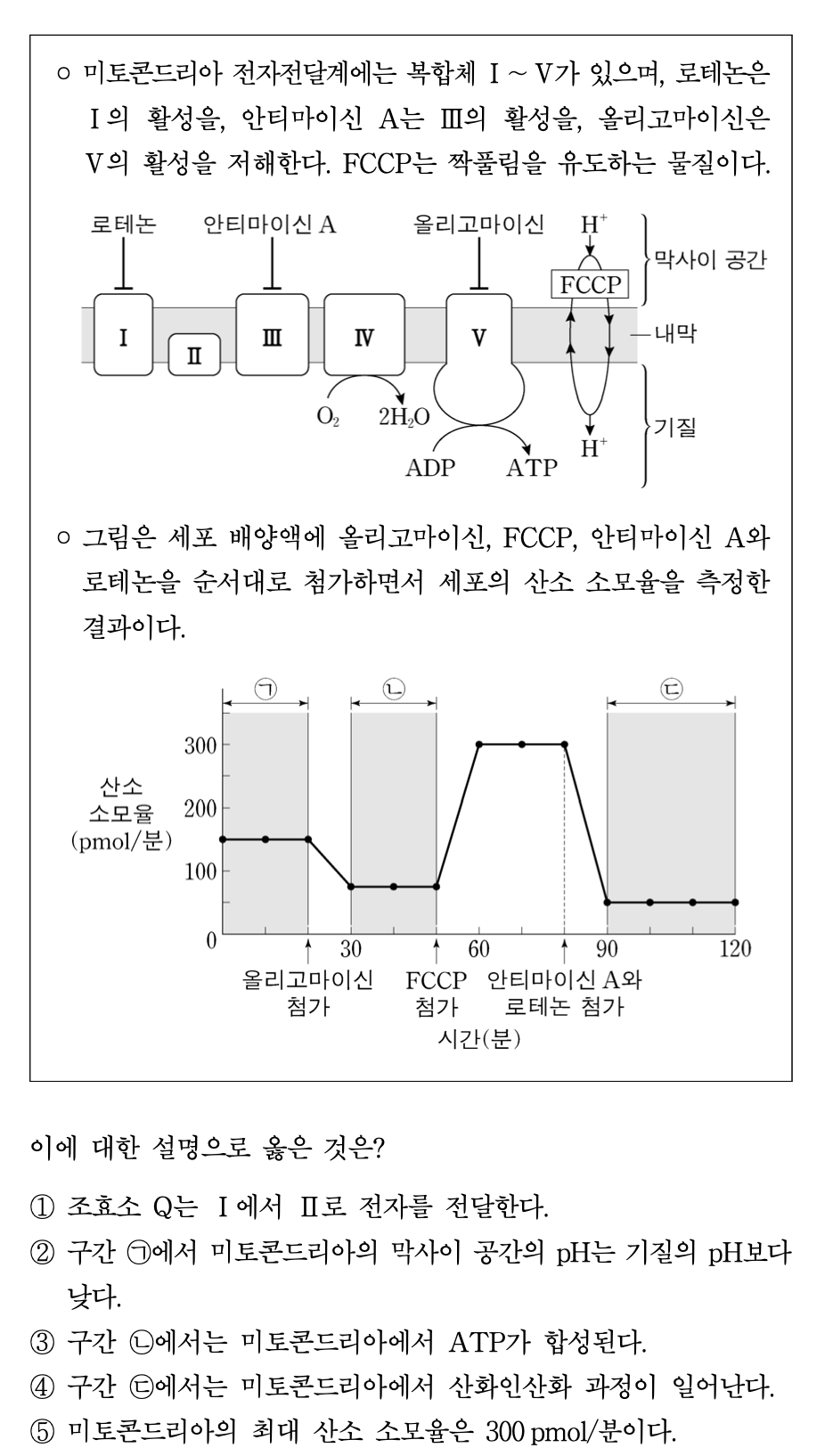 ⑤ 300 pmol/분에는 미토콘드리아 산소 소모뿐 아니라 비미토콘드리아 산소 소모가 포함되어 있기 때문에 틀림. 최대 미토콘드리아 산소 소모율은 FCCP 처리 후 산소 소모율 − 안티마이신 A·로테논 처리 후 잔여 산소 소모율로 계산됨