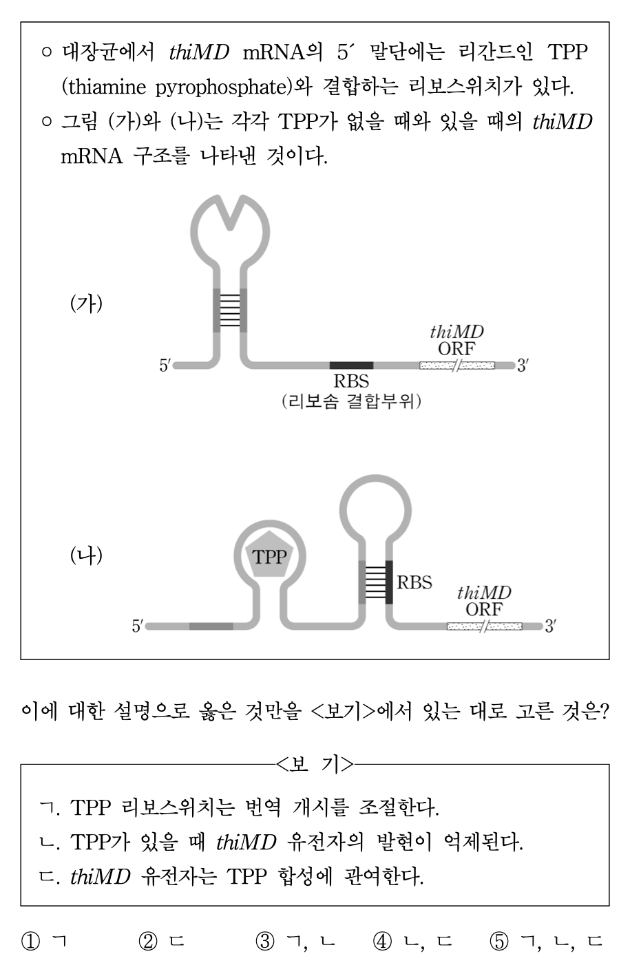 ○ ㄷ : thiMD 유전자가 TPP 합성에 관여하므로 리보스위치는 자동으로 TPP 합성량을 조절하는 기전으로 기능함
