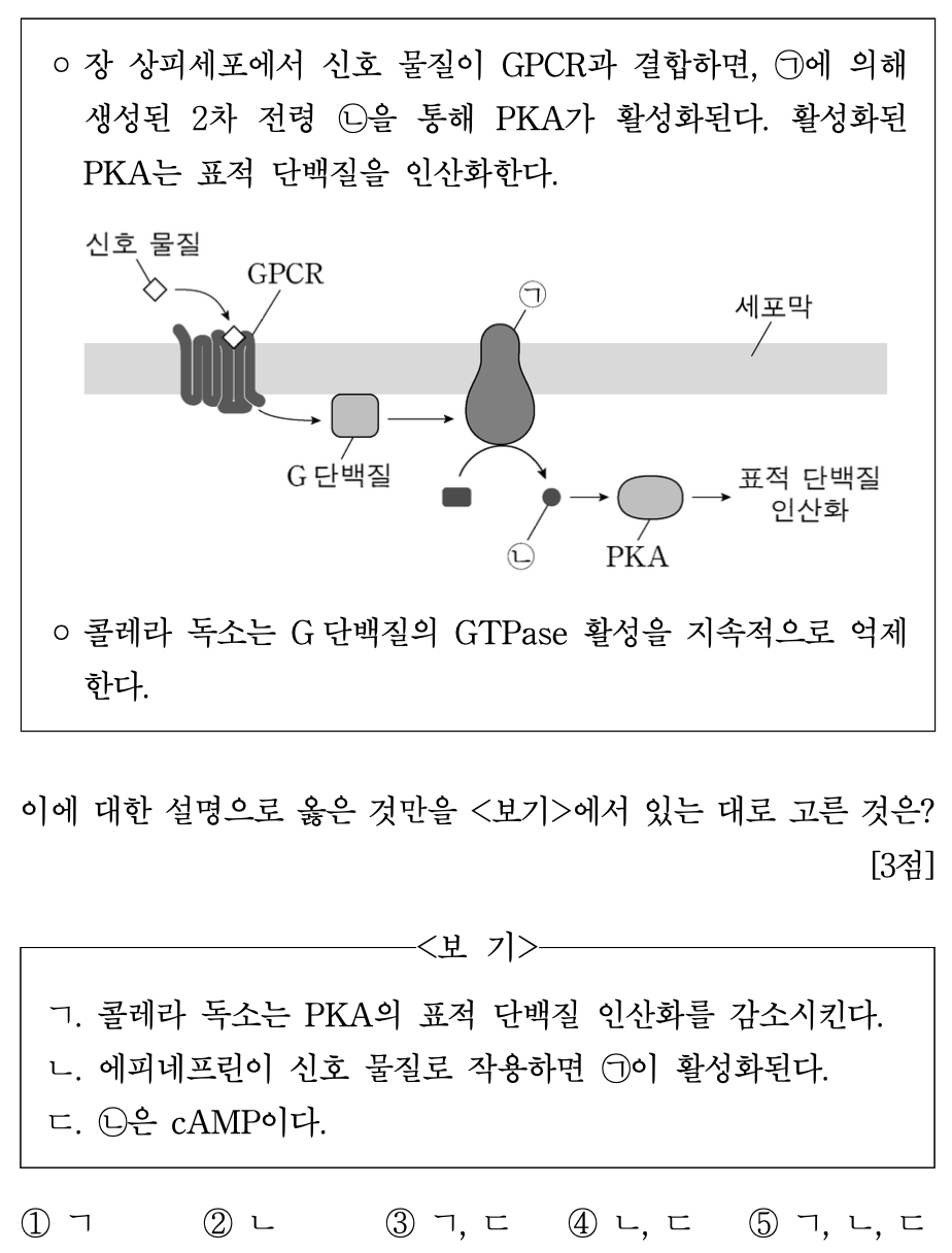 9. 다음은 장 상피세포에서 GPCR (G protein-coupled receptor)에 의한 단백질인산화효소 A (PKA)가 활성화되는 신호 전달 과정과 콜레라 독소의 작용에 대한 자료이다. 이에 대한 설명으로 옳은 것만을 ⟨보기⟩에서 있는 대로 고른 것은?