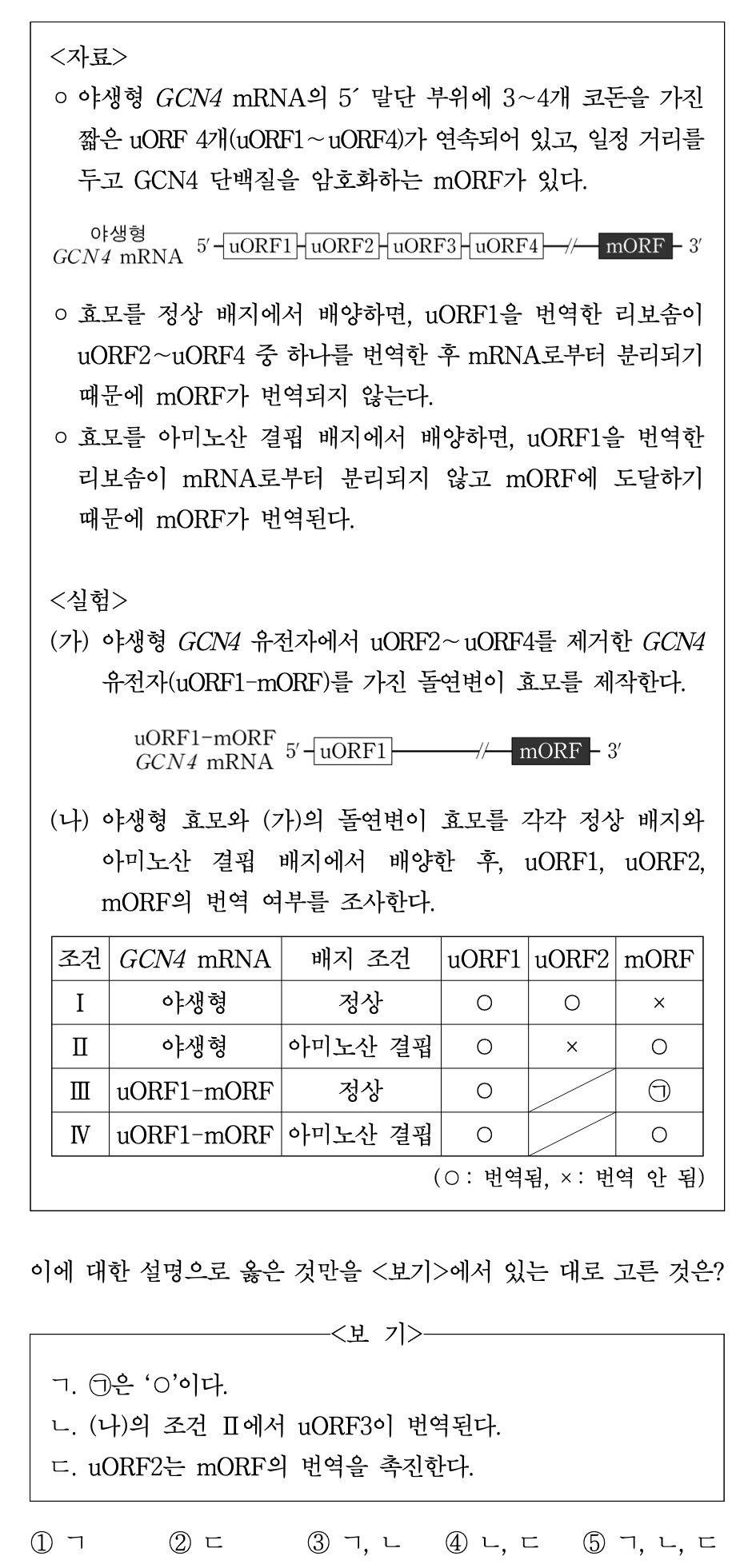 ○ㄱ, ㄷ : GCN4 mRNA의 구조는 트립토판 오페론 감쇄조절 기작과 비슷한 구조로 보임. 아미노산이 부족한 경우 해당 아미노산을 합성하기 위해 GCN4 mRNA가 합성되며, 정상 배지에서는 uORF1을 번역한 리보솜이 uORF2 ~ uORF4 중 하나를 번역할 때 헤어핀 구조가 생겨 자연스럽게 리보솜이 mRNA로부터 분리되는 구조일 것으로 추정됨. uORF1-mORF의 경우 그러한 헤어핀 메커니즘이 없어 정상 배지 조건에서도 mORF가 번역됨