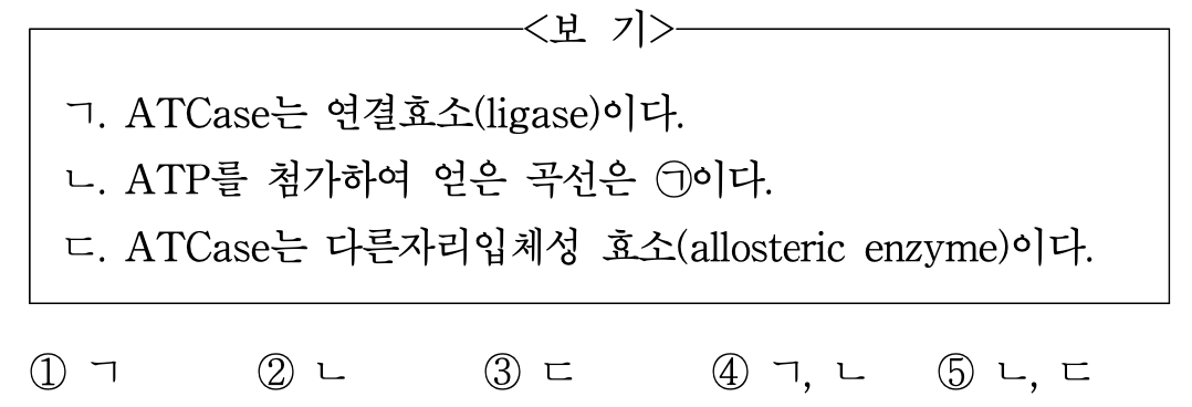 17. 다음은 피리미딘 생합성에 관여하는 ATCase (aspartate transcarbamoylase)에 대한 자료이다. 이에 대한 설명으로 옳은 것만을 ⟨보기⟩에서 있는 대로 고른 것은?