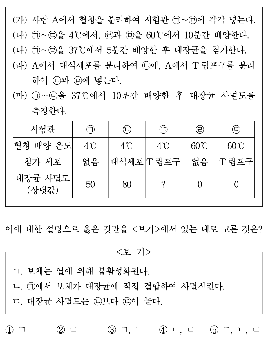 8. 다음은 보체계(complement system)의 세균에 대한 면역반응을 알아본 실험이다. 이에 대한 설명으로 옳은 것만을 ⟨보기⟩에서 있는 대로 고른 것은?
