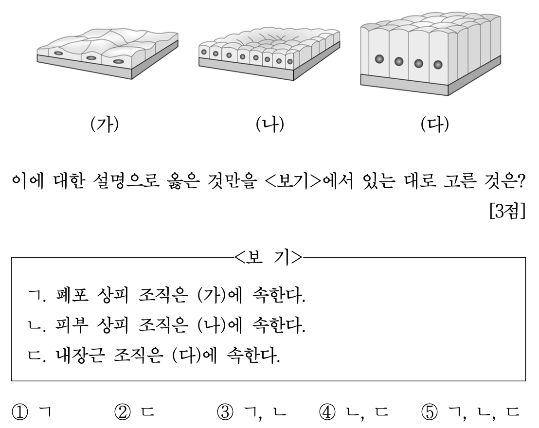 1. 그림 (가) ~ (다)는 사람의 서로 다른 조직을 나타낸 것이다. 이에 대한 설명으로 옳은 것만을 ⟨보기⟩에서 있는 대로 고른 것은?