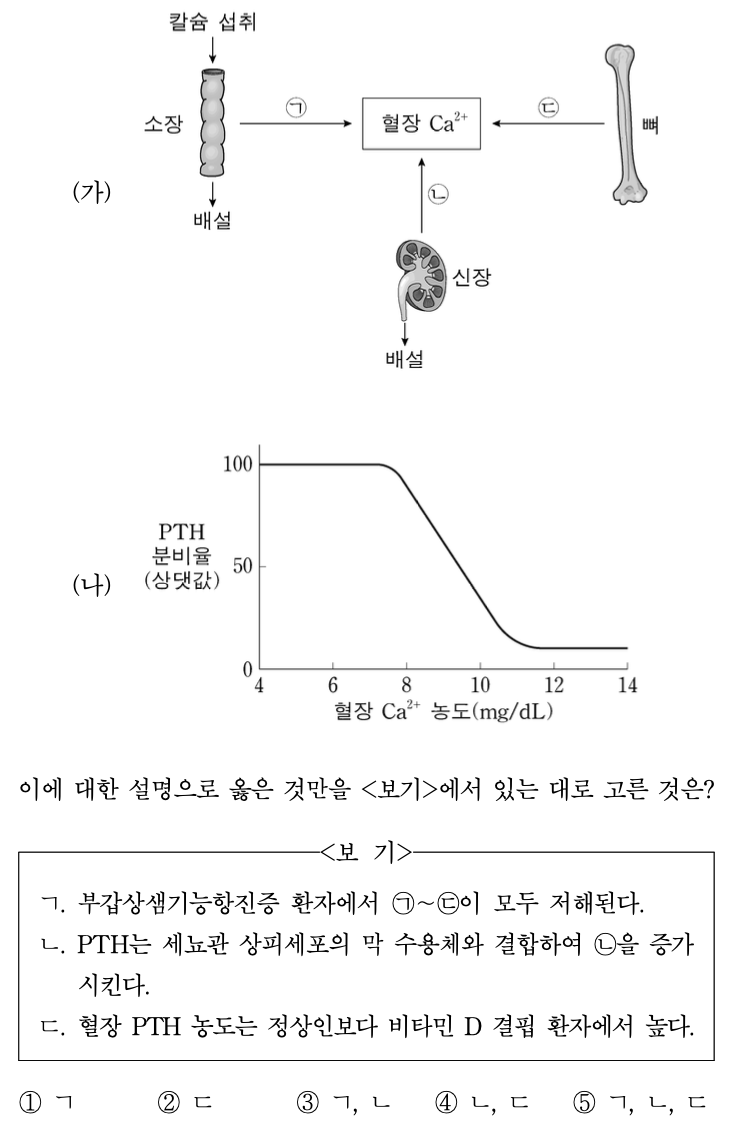 ○ ㄷ : 비타민 D 결핍 환자의 경우 소장 내 칼슘 흡수가 감소하여 혈중 칼슘 농도 증가 시그널(즉, 혈장 PTH 농도)이 증가