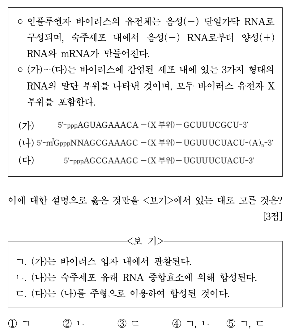 ○ ㄱ, ㄷ : (나)는 5' cap과 poly A tail이 있으므로 최종 mRNA. 따라서 (나)와 유사하게 생긴 (다)가 바이러스 유전체이고, 이를 주형으로 (가) 양성(+) RNA가 다수 합성되며, 양성(+) RNA를 주형으로 (나) mRNA가 다수 만들어짐