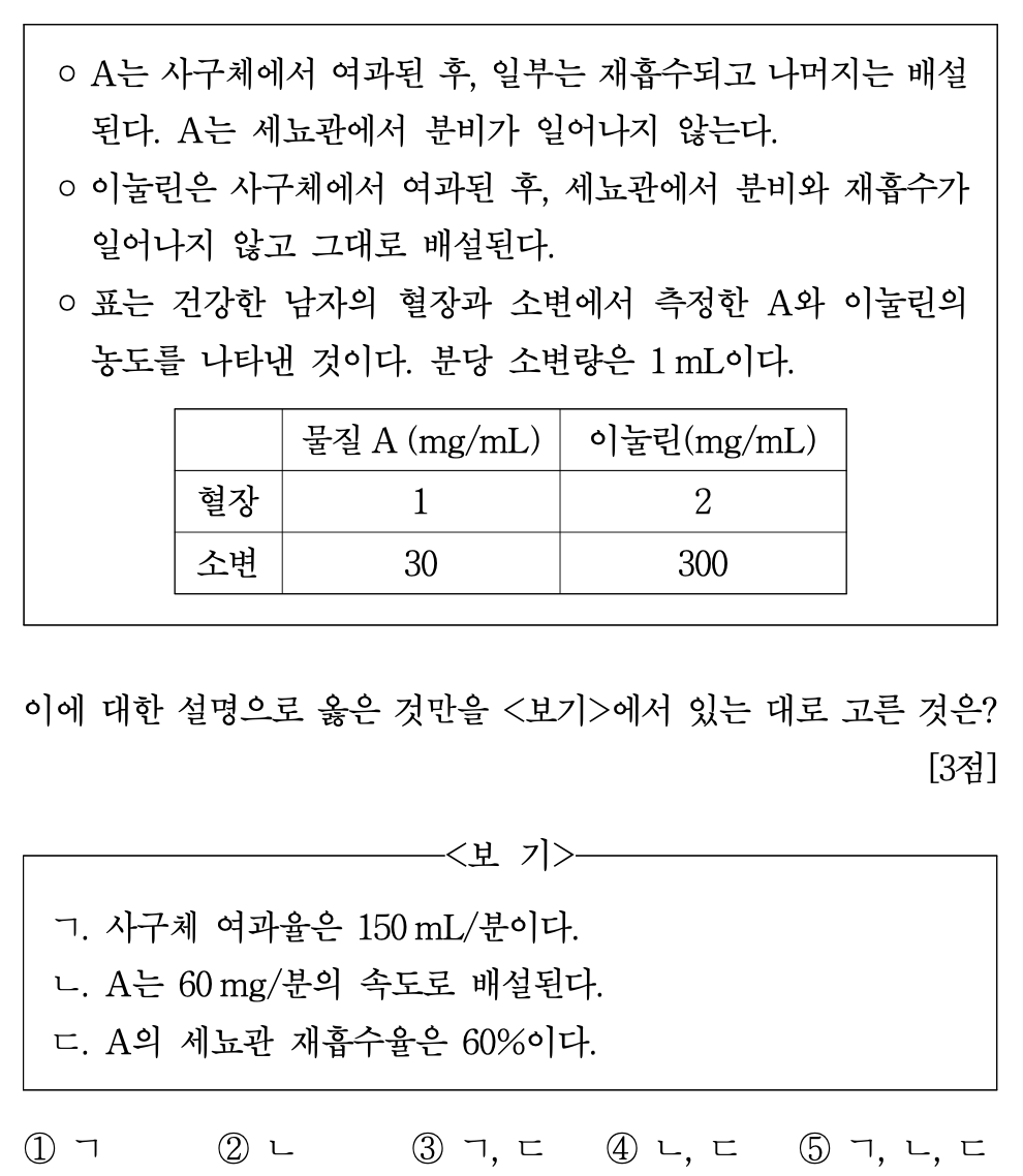 ○ ㄷ : A의 세뇨관 재흡수율 = [(1 mg/mL × 150 mL/분) - 30 mg/분] / (1 mg/mL × 150 mL/분) = 0.8 = 80%