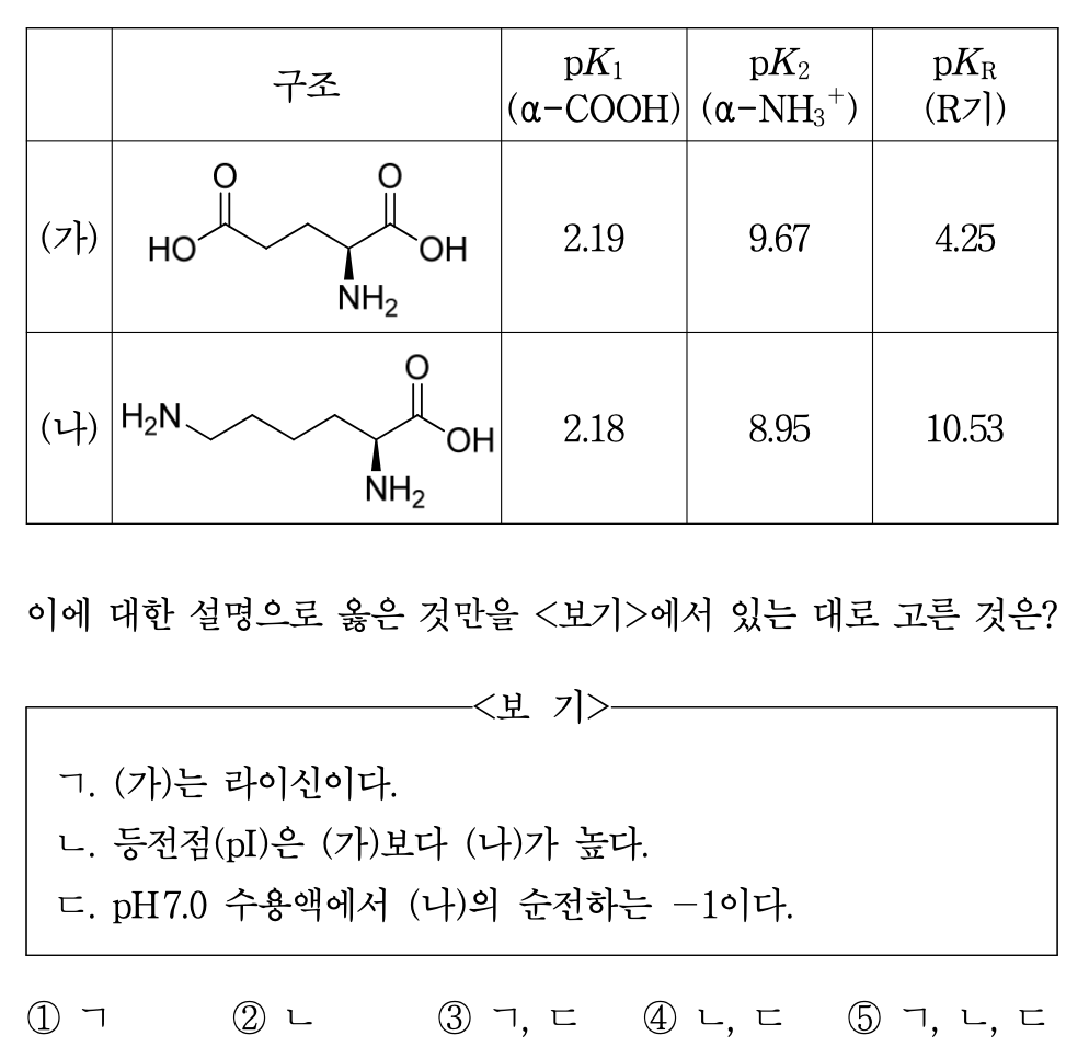 ○ ㄱ : 라이신은 대표적인 양전하 아미노산으로 작용기가 아민인데 현재 작용기가 카르복실산으로 돼 있어서 틀림