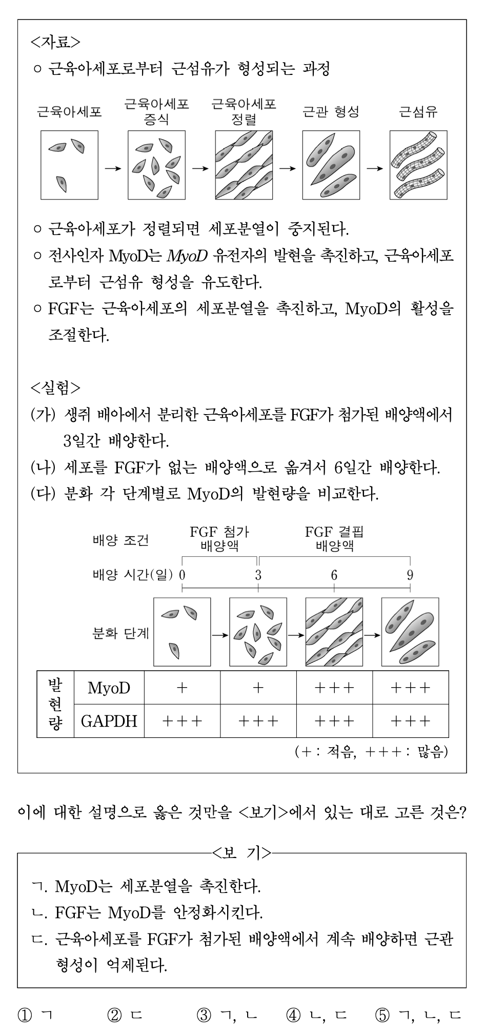 ○ ㄴ, ㄷ : FGF는 세포분열을 촉진하므로 MyoD를 억제 (실험 데이터로 FGF, MyoD 연관성 확인) → 근관, 근섬유 형성 억제