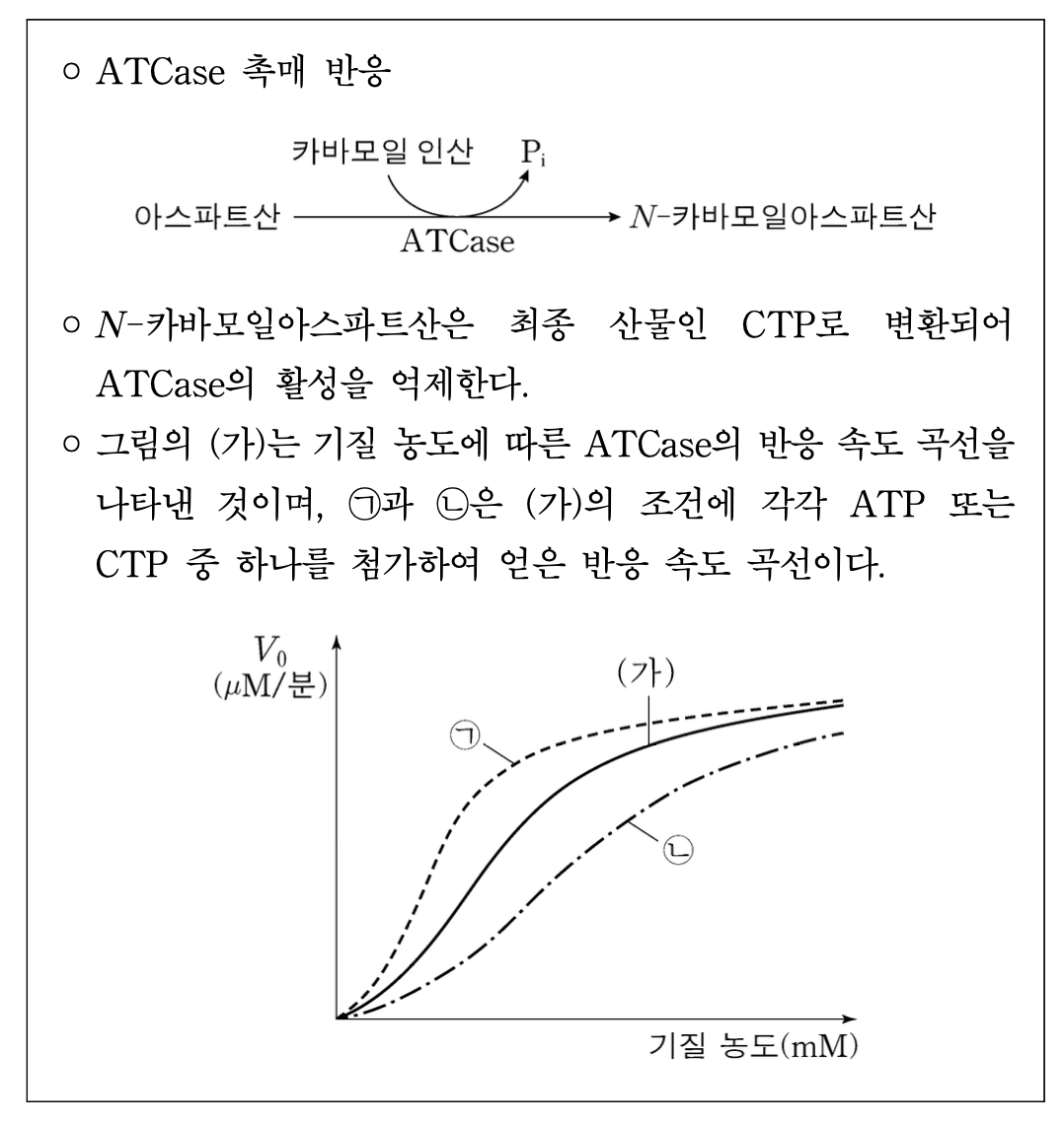 ○ ㄴ : ATP는 반응속도롤 증가시키므로 그래프 (가)를 상방이동시키고, CTP는 반응속도를 감소시키므로 그래프 (가)를 하방이동