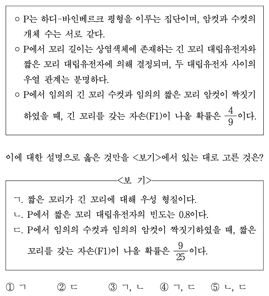 ○ ㄴ : P에서 짧은 꼬리 대립 유전자의 빈도를 p라 두면, F1이 긴 꼬리를 가질 확률 = 4/9 = P(짧은 꼬리 암컷이 이형접합) × 1/2 = 2pq / (p2 + 2pq) × 1/2로부터 p = 0.2를 얻을 수 있음