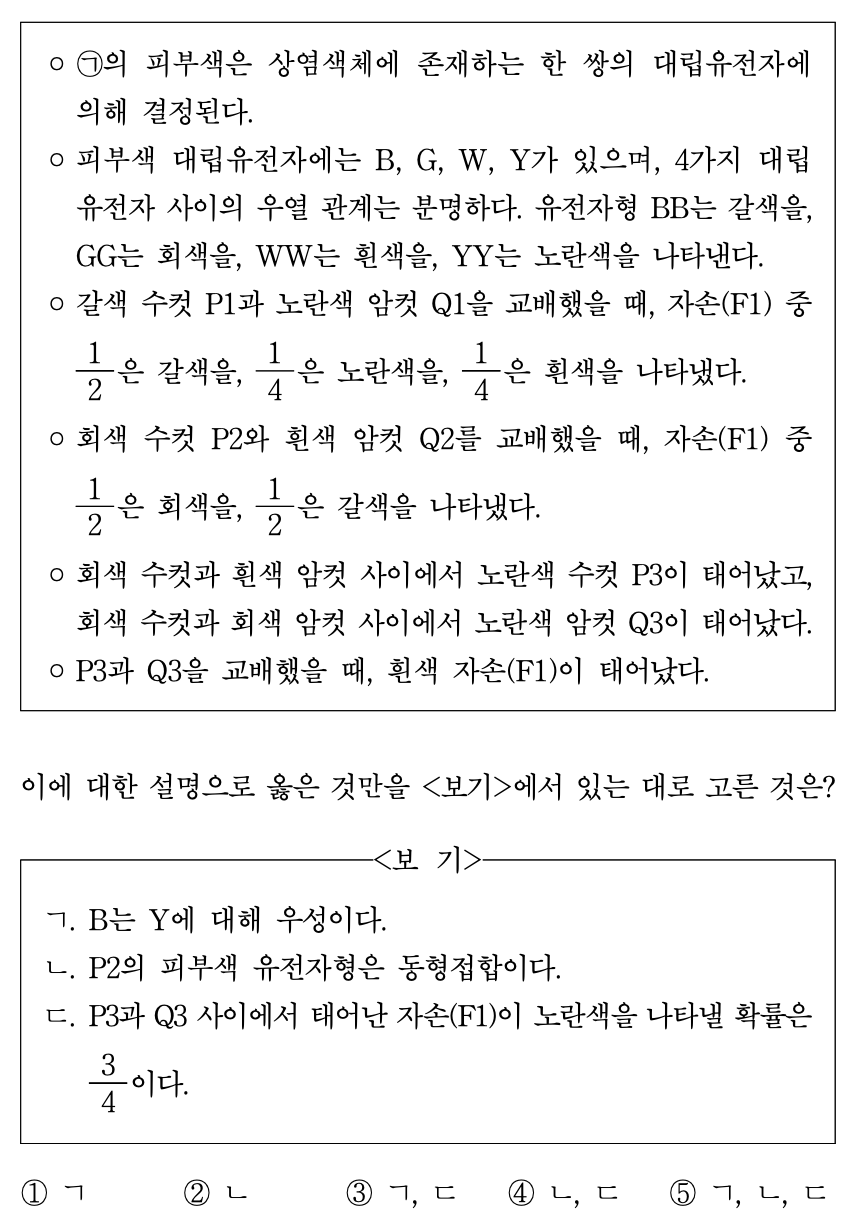 26. 다음은 어떤 동물 ㉠의 피부색 유전에 대한 자료이다. 이에 대한 설명으로 옳은 것만을 ⟨보기⟩에서 있는 대로 고른 것은?