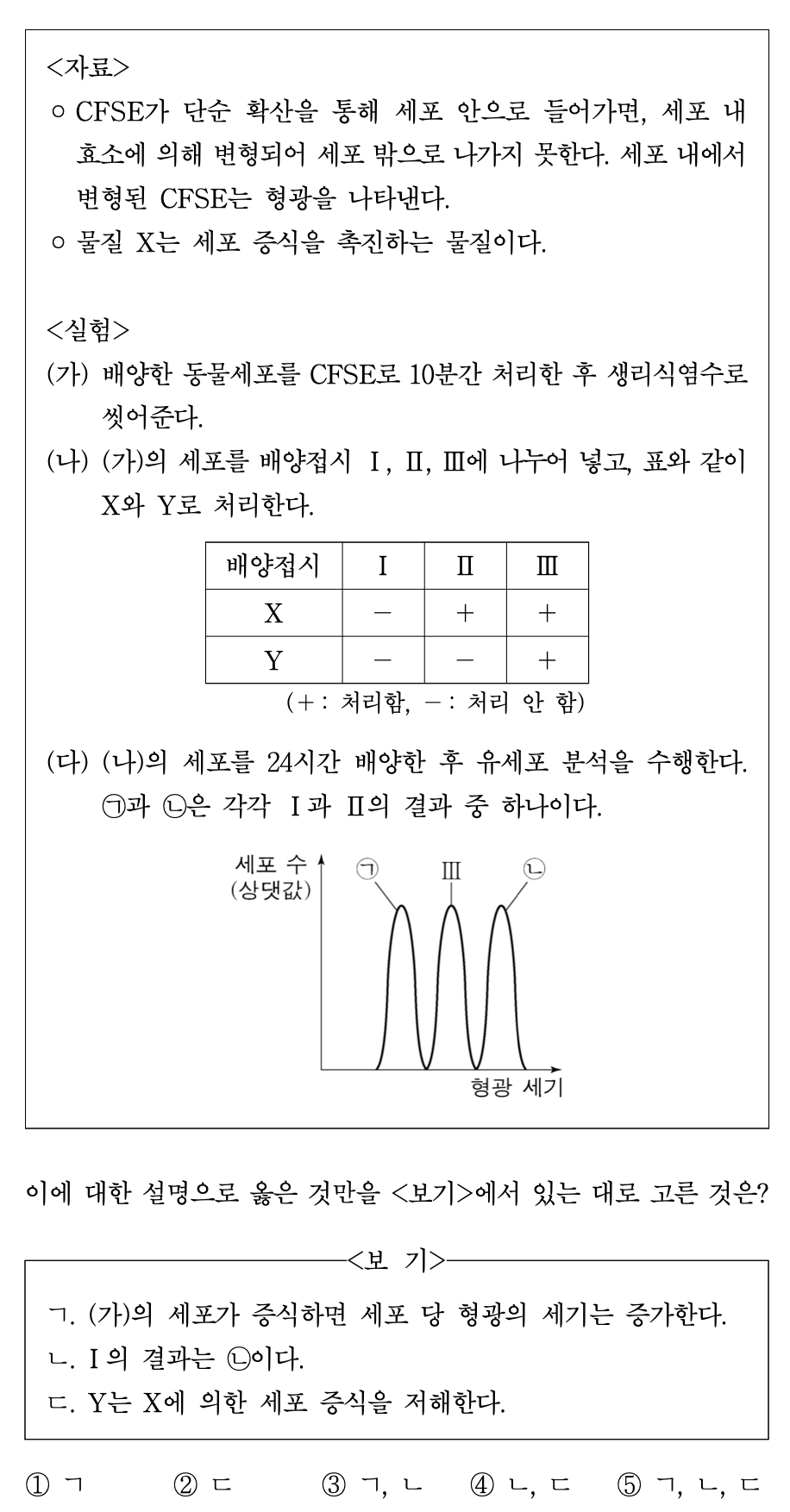 29. 다음은 CFSE를 이용하여 물질 Y가 세포 증식에 미치는 효과를 알아본 실험이다. 이에 대한 설명으로 옳은 것만을 ⟨보기⟩에서 있는 대로 고른 것은?
