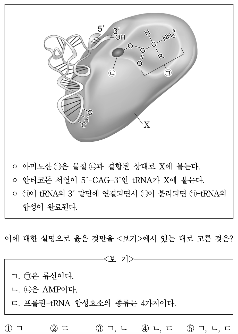 13. 다음은 아미노아실-tRNA 합성효소 X에 의해 아미노아실-tRNA가 합성되는 과정에 대한 자료이다. 이에 대한 설명으로 옳은 것만을 ⟨보기⟩에서 있는 대로 고른 것은?