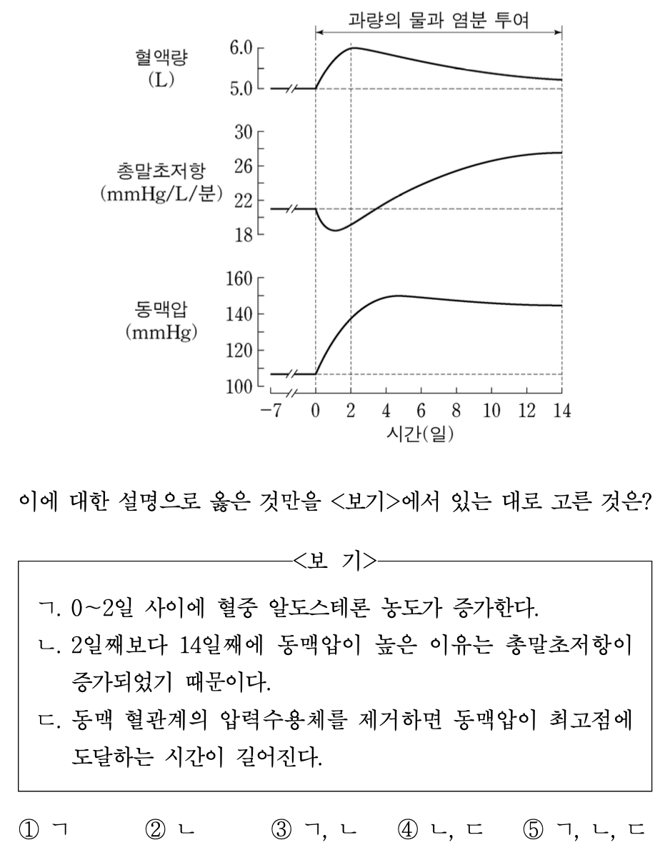 ○ ㄴ : 초기에 총말초저항이 감소한 건 체액량의 일시적 증가로 혈관 직경을 넓혀서 그 변화를 상쇄하기 위한 작용. 장기적으로는 체액량이 계속 증가해서 총말초저항이 증가하고 이로 인해 동맥압도 높아진 것