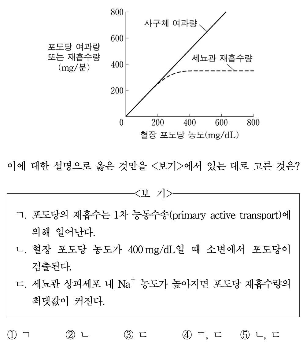 ○ ㄷ : 일반적으로 세포 외 Na+가 높음. 포도당 재흡수는 Na+가 상피세포 내로 이동할 때 포도당이 같이 공수송되면서 일어남. 세뇨관 상피세포 내 Na+ 농도가 높아지면 Na+ 농도기울기가 약해져서 포도당 재흡수량의 최댓값이 작아짐