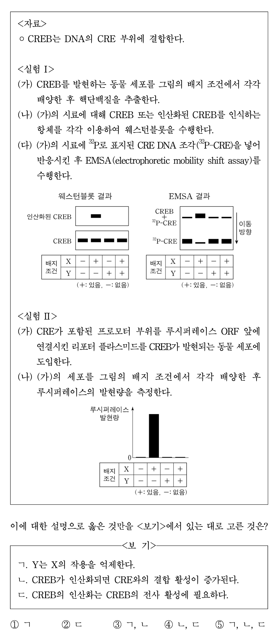 ○ ㄴ : X는 +, Y는 -인 조건에서만 유일하게 인산화된 CREB가 존재하고 이 경우 EMSA에 의해 CRE와의 결합이 확인됨. 이에 CREB가 CRE 부위에 결합한다는 사전 설명이 주어져 있으므로 CREB의 인산화는 CRE 결합 활성 증가를 암시한다고 할 수 있음