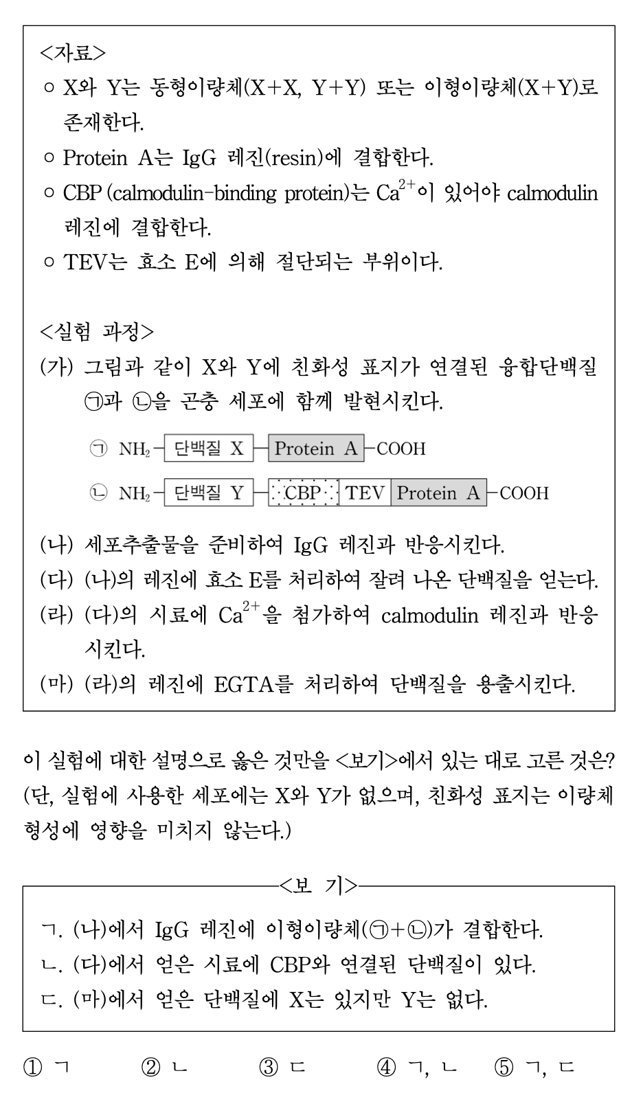 ○ ㄴ : 맞는 설명. 또한, ㄴ이 맞아야 (라)의 칼모듈린 설명과 정합성이 맞음. 참고로, TEV 효소(Tobacco Etch virus protease)는 특정 아미노산 서열(ENLYFQ↓S)을 인식