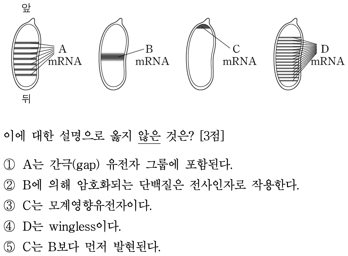 21. 그림은 야생형 초파리 배아에서 유전자 A~D의 mRNA 분포 양상을 나타낸 것이다. A~D는 각각 bicoid, even-skipped, krüppel, wingless 중 하나이다. 이에 대한 설명으로 옳지 않은 것은?