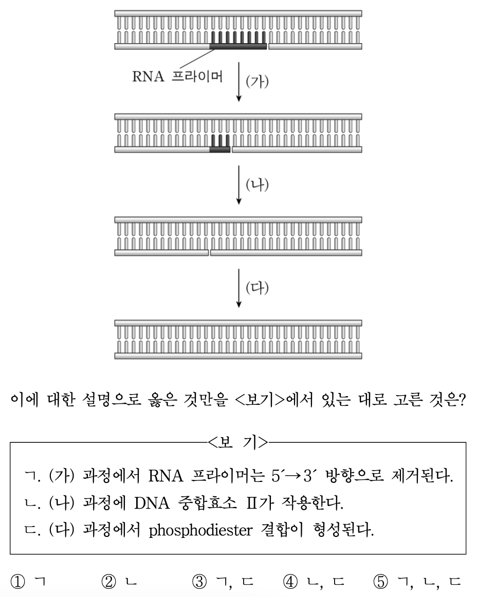 ○ ㄱ : RNA 프라이머는 DNA 중합을 위한 3' 말단을 제공하기 위한 것으로 그림을 보면 5' → 3' 방향으로 제거됨을 알 수 있음