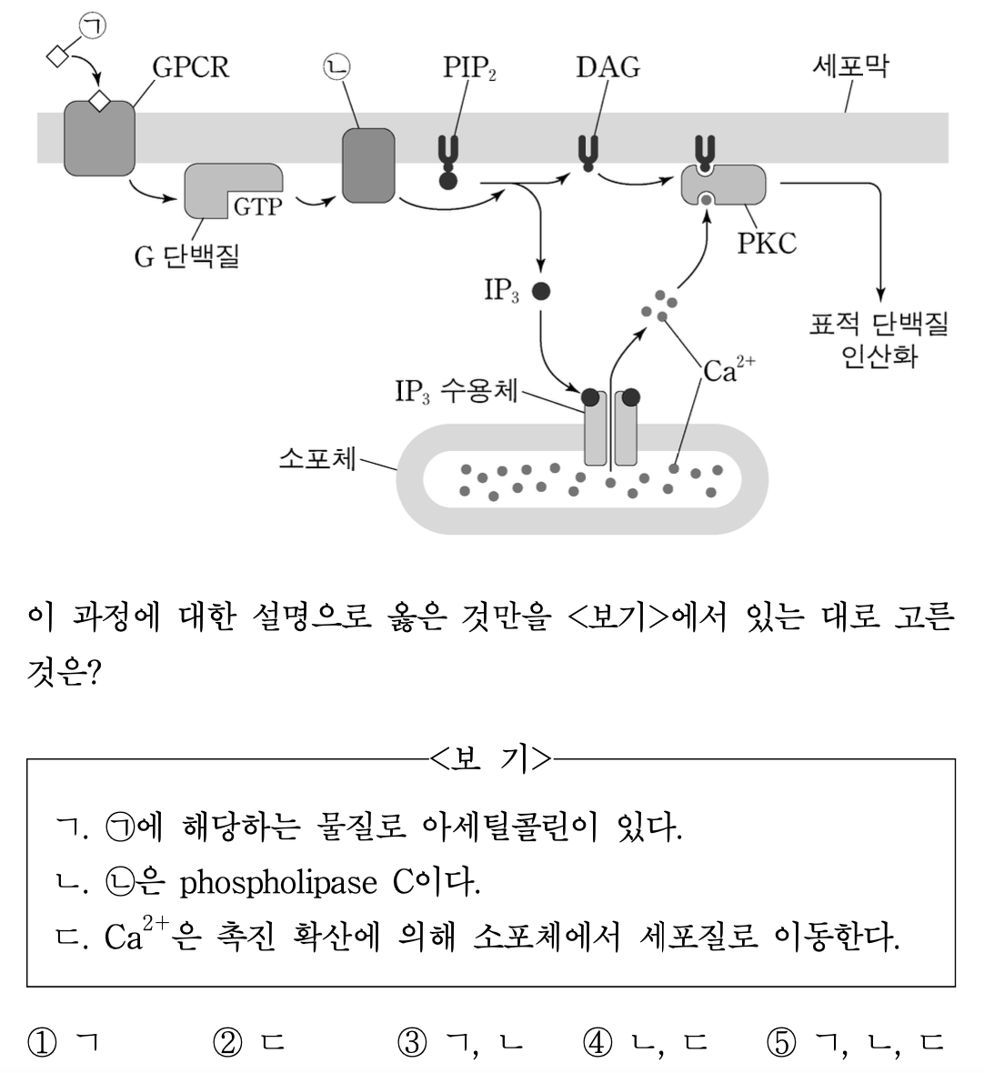 28. 그림은 췌장세포에서 GPCR(G protein-coupled receptor)에 의해 단백질인산화효소 C(PKC)가 활성화되는 신호전달 과정을 나타낸 것이다. ㉠은 GPCR과 결합하는 신호 물질이고, ㉡은 GPCR에 의해 활성화되는 효소이다. 이 과정에 대한 설명으로 옳은 것만을 ⟨보기⟩에서 있는 대로 고른 것은?