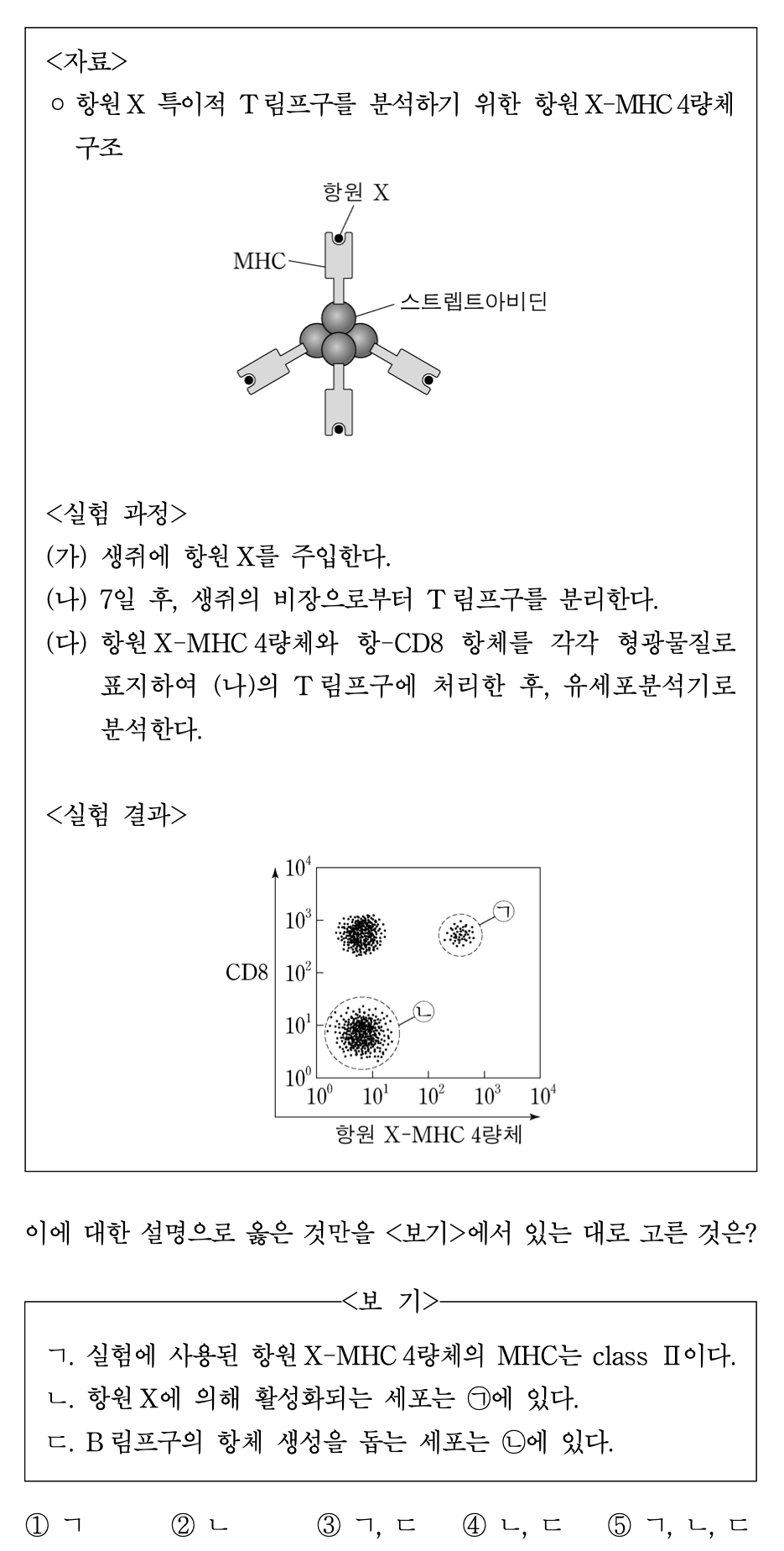 ○ ㄱ, ㄴ : 형광을 띠는 항원 X-MHC 4량체를 주입하면 CD8+ T 세포가 TCR로 항원 X-MHC와 결합을 이루어 형광을 띨 수 있음. 따라서 ㄱ은 항원 X에 의해 활성화된 CD8+ T 세포라고 할 수 있음