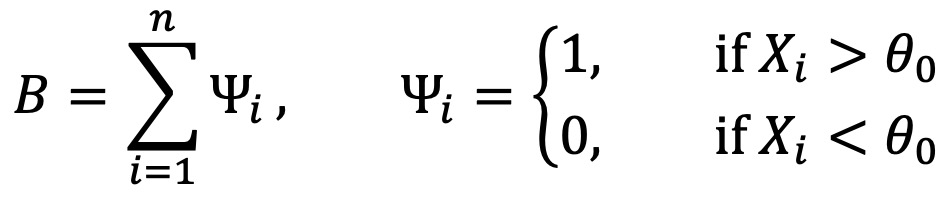 ○ 대립가설이 θ ≠ θ0라면, 기각역은 B ≥ b(α/2, n, 1/2) 또는 B < b(1 - α/2, b, 1/2)