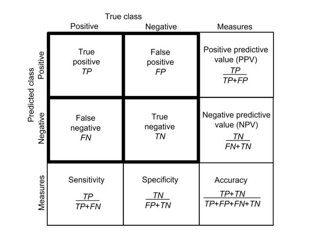 ① 참 긍정(TP, true positive) : 실제값이 true이고 측정값이 true인 경우. (주석) 진짜 포지티브란 의미