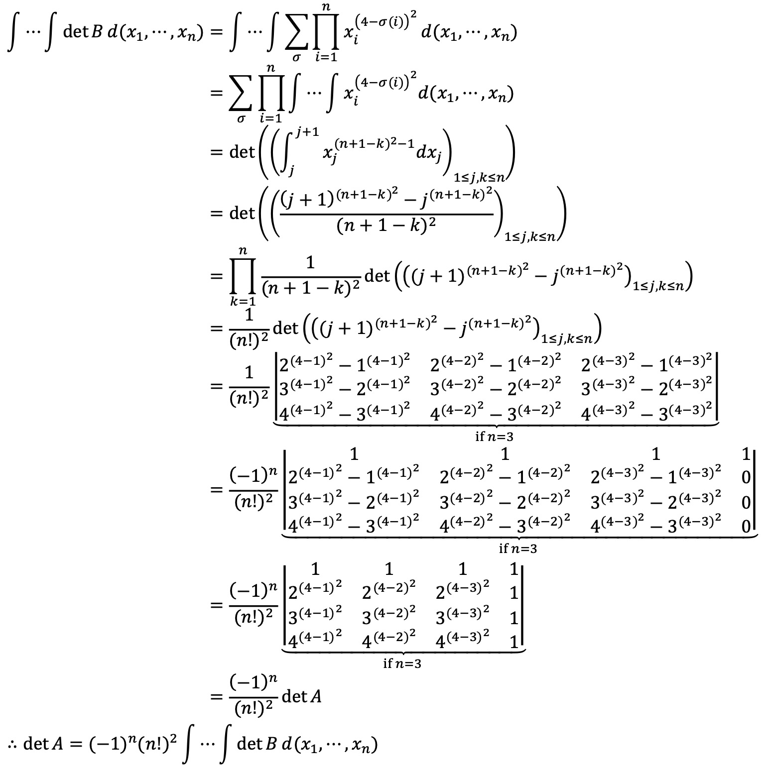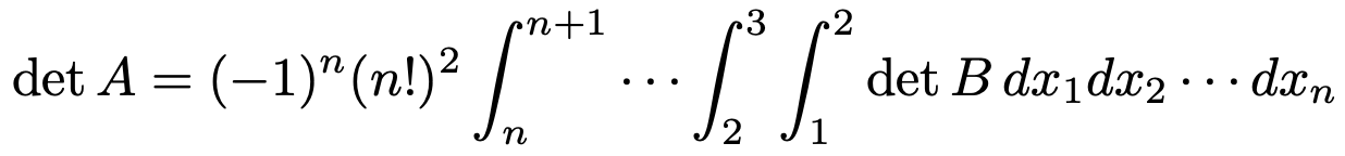 치환 개념을 적절히 쓰면 ∫ ⋯ ∫ det B dx1 ⋯ dxn = det ( (∫ bjk dxj)1≤j,k≤n )임을 보일 수 있어, 행렬식의 성질과 함께 (준식)을 보일 수 있다.