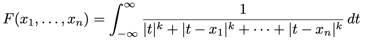 그러므로 (준식) = ∫(0,1)n F(x)p dx ~ ∫(0,2π) ∫(0,ε) rn-1 · rp(1-k) dr dθ < ∞ ⇔ (n-1) + p(1-k) + 1 > 0 ⇔ p < n / (k-1)을 얻는다.