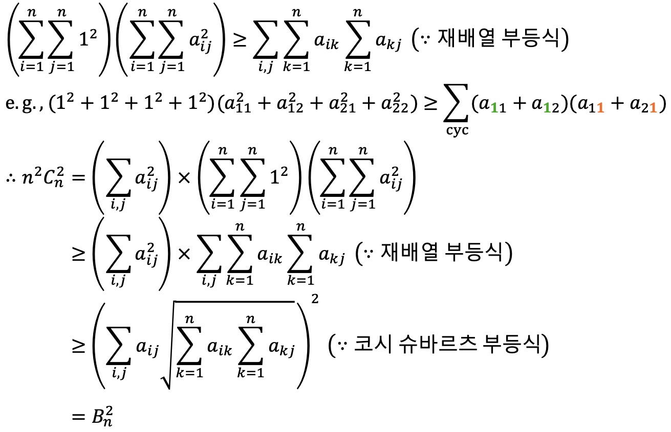 이해를 위해 n2Cn = (12 + ··· + 12)Cn ≥ An은 코시-슈바르츠 부등식으로 빠르게 증명할 수 있음을 먼저 확인한다.