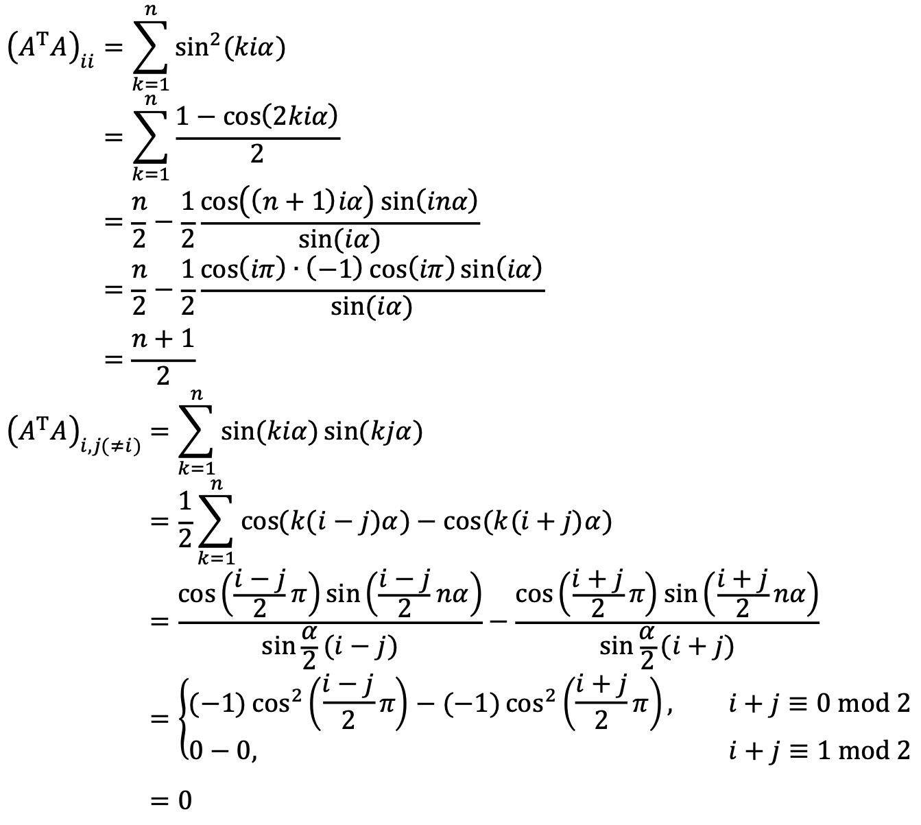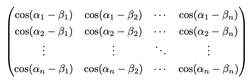 아래와 같은 40회 대수경 2분야 3번과 유사하긴 하지만 αi - βj = π/2 - i × j × π / (n + 1)인 αi, βj는 존재하지 않으므로 다른 문제이다.