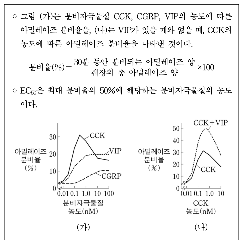 ○ ㄴ : 그래프 (나)를 보면 CCK와 VIP가 상승 작용이 있으므로 같은 신호전달계를 공유하는 건 아님