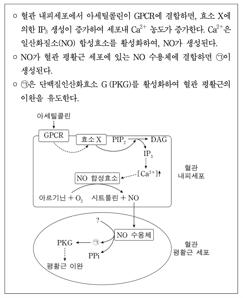 13. 다음은 혈관 내피세포에서 아세틸콜린에 의한 신호전달과 혈관 평활근의 이완에 대한 자료이다. 이에 대한 설명으로 옳은 것만을 ⟨보기⟩에서 있는 대로 고른 것은?
