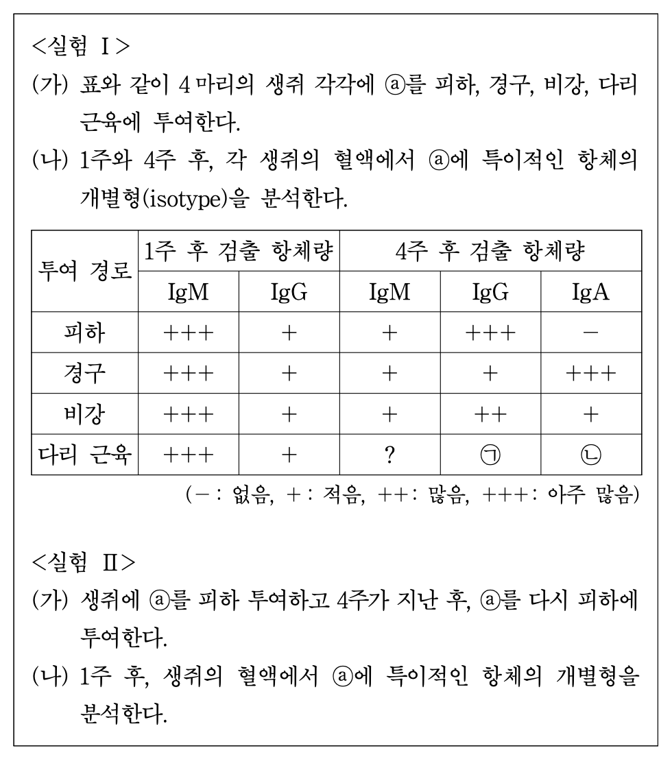 ○ ㄱ : 소화관의 점막에서 주요 분비되는 (그래서 효과적인) 항체는 IgA이므로 이것이 많이 분비되도록 경구 투여해야 함