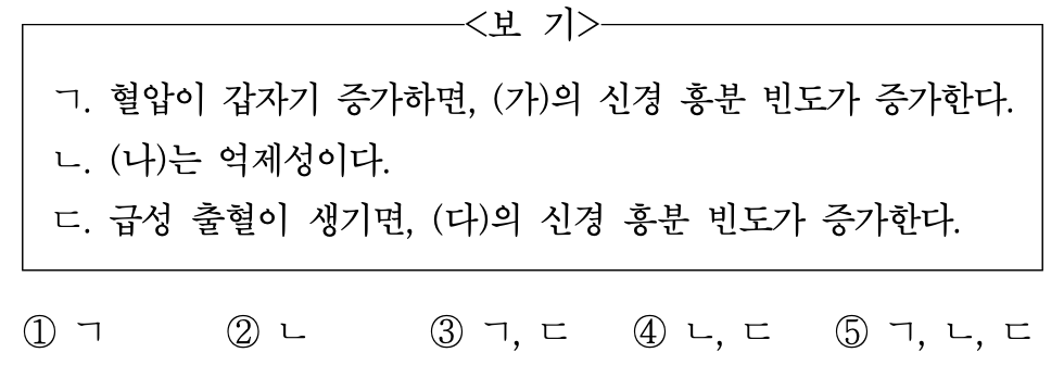 ○ ㄱ : 혈압이 갑자기 증가하면 심장억제중추가 활성화돼야 하므로 (가)의 신경 흥분 빈도가 증가함은 맞는 설명. 참고로, 부교감신경이 편안하고 안정된 상태와 관련돼 있으므로 일관성 있음을 간단히 체크