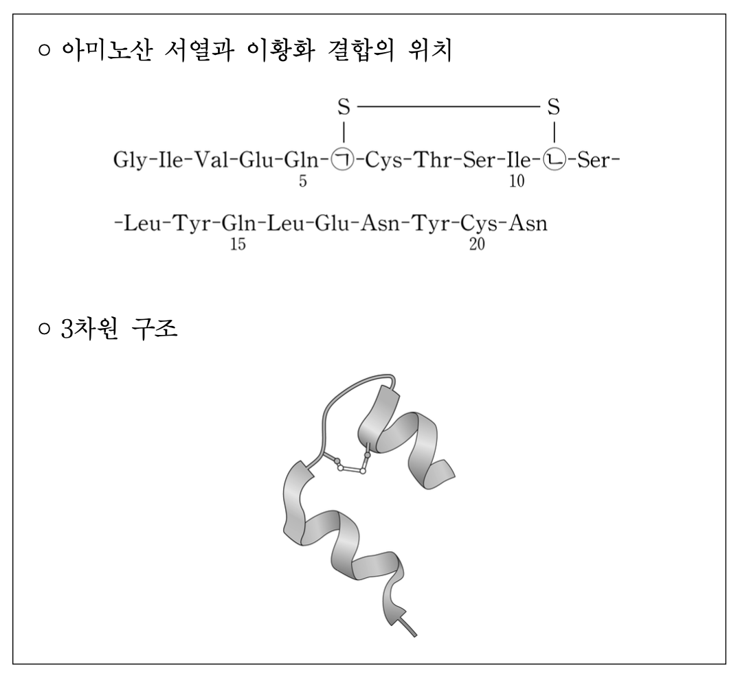 2. 다음은 인슐린 A 사슬의 아미노산 서열과 3차원 구조이다. 이에 대한 설명으로 옳은 것만을 ⟨보기⟩에서 있는 대로 고른 것은?