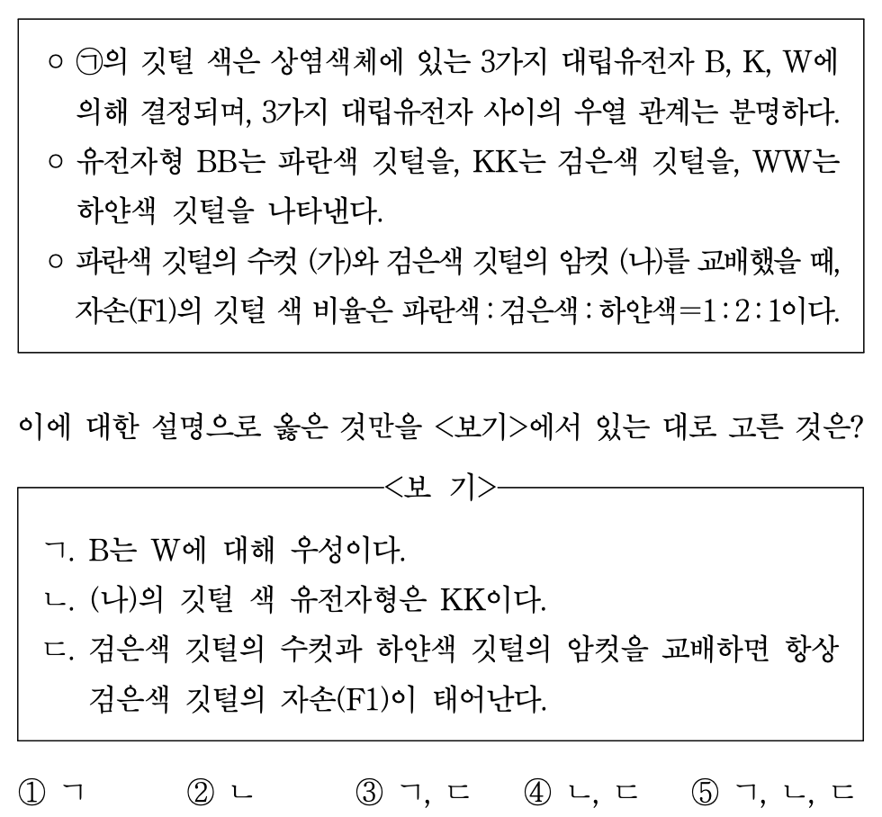 ○ ㄴ : BW × KW로 하면 1 : 2 : 1 비율이 달성됨. 이때 2에 해당하는 검은색이 가장 우성형질. 즉 K > B > W