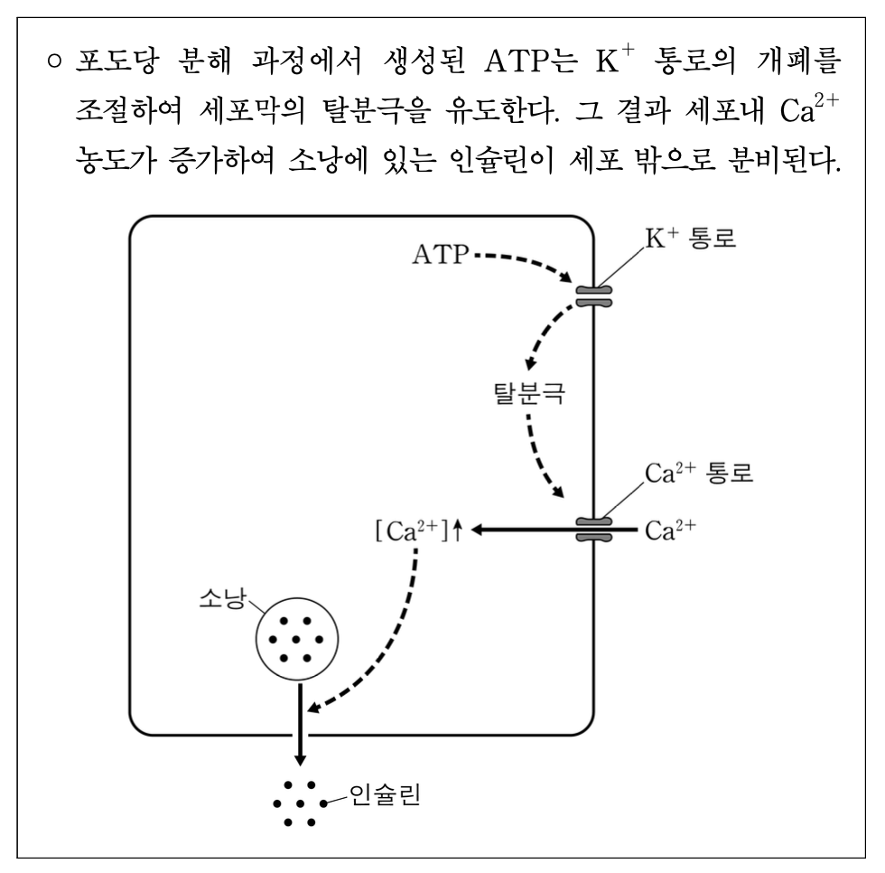 ○ ㄱ : 포도당이 많아지면 인슐린이 분비돼야 함. 그러려면 K+ 통로에 의한 탈분극이 일어나야 하고, 그래서 세포 내액의 고농도의 K+가 세포 외로 빠져나가지 말아야 함. 따라서 K+ 통로가 닫혀야 함