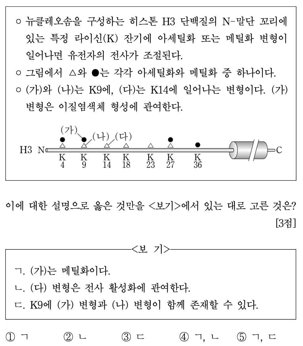 ○ ㄷ : 아세틸기와 메틸기가 같은 K9의 아미노기 자리를 경쟁하므로 틀린 설명. 참고로, 그 영향도 정반대이기 때문에 화학적 이해 없이도 생물학적으로 쉽게 유추할 수 있음