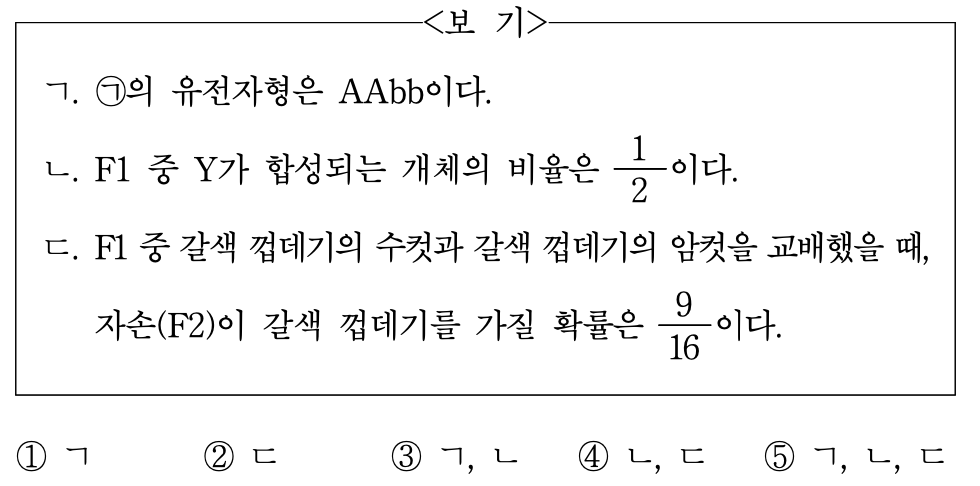 ○ ㄴ : F1 = {AaBb, Aabb, aaBb, aabb}이므로 Y가 합성되는 개체의 비율 = #{AaBb, Aabb} / 4 = 1/2