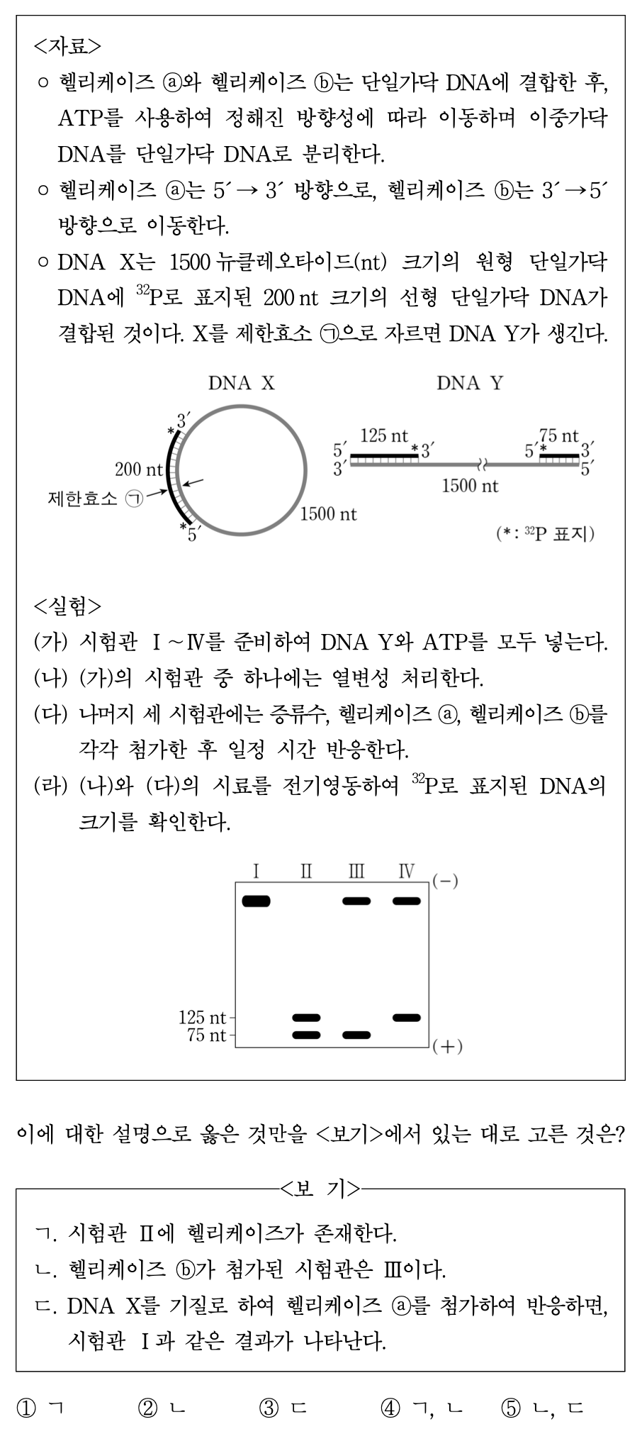○ ㄴ : 시험관 Ⅲ의 경우 75 nt가 분리됨. 헬리케이스는 단일 가닥에 먼저 붙은 뒤 DNA 절편으로 이동하므로 그 이동 경로는 3' → 5'이어야 함. 따라서 헬리케이즈 ⓑ가 포함돼 있음