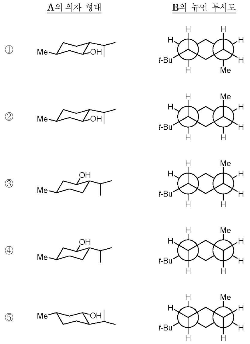 3. 다음 카이랄(chiral) 화합물의 가장 안정한 형태(conformation)를 의자 형태(chair conformation)와 뉴먼 투시도(Newman projection)로 모두 옳게 나타낸 것은?